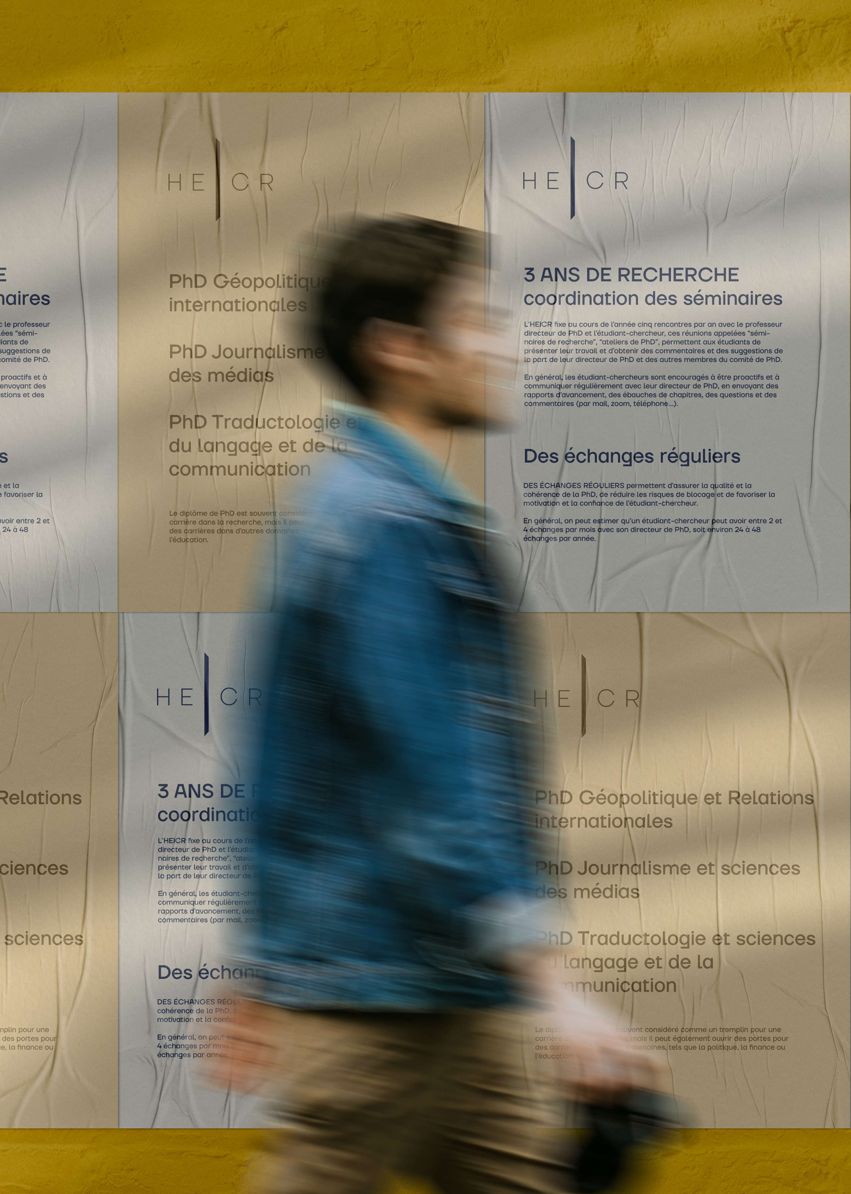 L’HEICR fixe au cours de l’année cinq rencontres par an avec le professeur directeur de PhD et l’étudiant-chercheur, ces réunions appelées “séminaires de recherche”, “ateliers de PhD”, permettent aux étudiants de présenter leur travail et d’obtenir des commentaires et des suggestions de la part de leur directeur de PhD et des autres membres du comité de PhD.